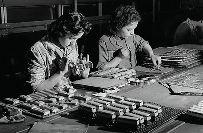 Production line staff working on Dinky Toys at the Meccano factory in Binns Road, Liverpool, where it was based for more than 60 years. Meccano and Dinky inventor Frank Hornby, a local boy, inspired a generation of children. Born in 1863, he also founding the model railway company which bears his name. He began his illustrious career by making toys for his own children and went on to become a millionaire.