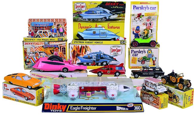 The mid-sixties to late seventies were a paradise for collectors of TV-related die-cast toys. Britain’s two main manufacturers engaged in a war to see who could create the most exciting products, combining high brand recognition, early “must have” advertising, and fiendishly clever design, often verging on the eccentric in search of increased playability. As a child it was always much more exciting to hold in my hand a model of a vehicle which did not exist than anything I could see in real life. A three-dimensional, accurate, model from my favourite Gerry Anderson series, say, bought those fantasy vehicles into the real world and connected me directly to those characters. Frankly, I still feel the same way today. Corgi were the first to capitalise on the market for high quality die-cast models of TV and Film favourites, immediately hitting the sweet spot in 1965 with their James Bond Aston Martin. The story of solid, dependable, Corgi is, however, for another day. Today belongs to the wonderfully haphazard Dinky Toys.