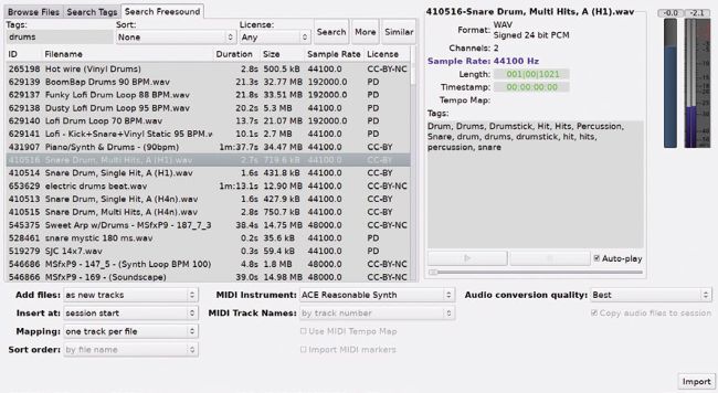 Browsing the Freesound library thanks to Ardour 7’s integration of it.