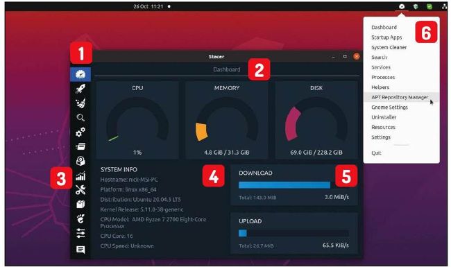 System Monitor is a useful tool, but it does lack a few key features. There’s no handy overview of your system as provided by the About section in Settings, for example, and there’s no way to monitor or manage services. If you’re in the market for a more powerful alternative, the good news is that it exists in the form of Stacer (https:// oguzhaninan.github.io/Stacer-Web).