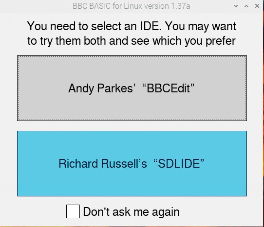 When you click the BBC Basic icon, you are offered two different IDEs: BBCEdit or SDLIDE. After trying both, if you decide you want to stay with your favourite, just tick the Don’t Ask Me Again checkbox. However,
