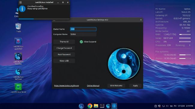 On first login, the OS launches LastOS Settings. It also begins setting up extra programs, such as Microsoft Visual Runtimes and Wine.