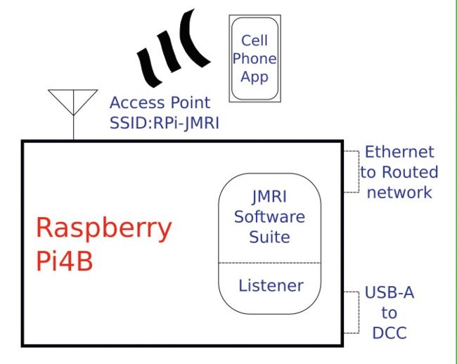 Smartphone talks to Pi AP. Pi runs JMRI, which talks to controller.