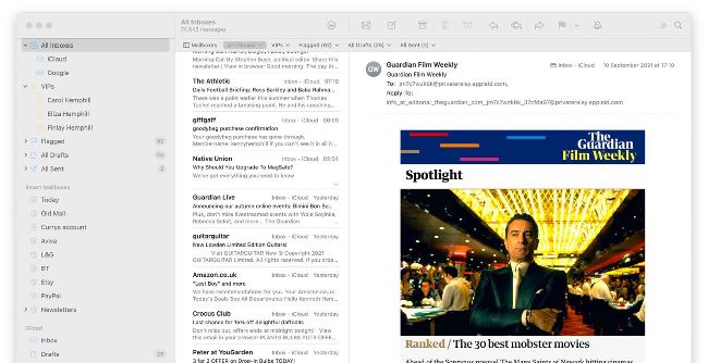 ne of the best things about Mail is that it can be as simple or as complicated as you want. If you use it with just one iCloud account and don’t send or receive a lot of email, you can leave preferences set at their defaults and just have a two-pane interface with the list of messages in your inbox in one, and the current message in the other. If you enable Show Favourites bar, you’ll be able to switch between your inbox, sent mail, drafts, flagged messages and VIPs easily, even without the mailbox list displayed.