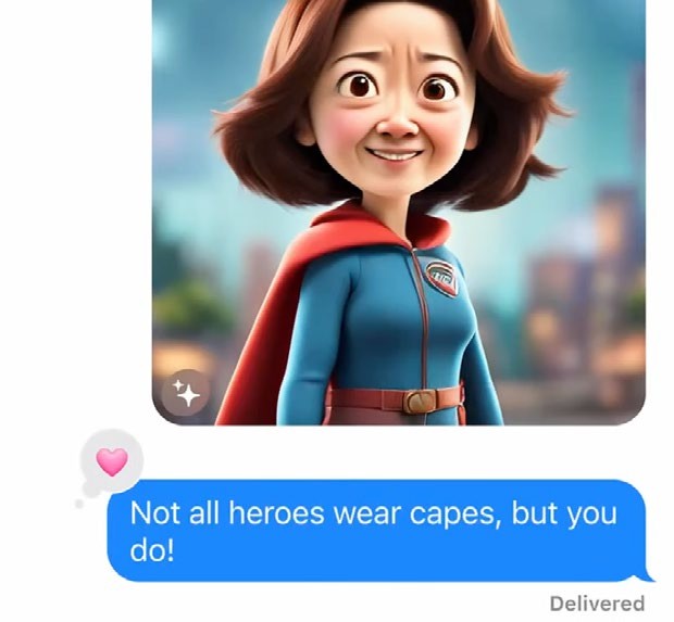 Tell mum she’s a hero, and send a picture of her wearing a cape, created in Messages using Apple Intelligence and her Contacts photo.