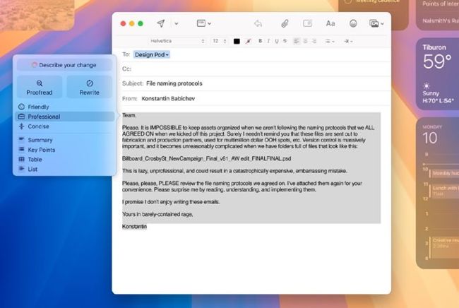 With the powerful Rewrite function you can have Apple Intelligence redo your writing, changing the tone if needed. Make it more friendly if it sounds stuffy, more professional if it’s too chatty or more succinct if too long.