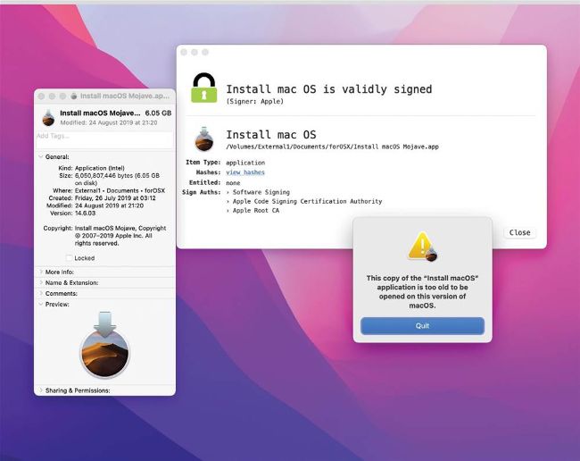 Although this Mojave installer’s signature seems OK, Monterey claims it’s too old to be used.