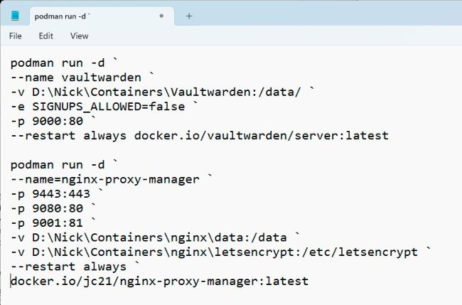 podman run -d --name vaultwarden -v C:/users/username/containers/vaultwarden:/data/-e