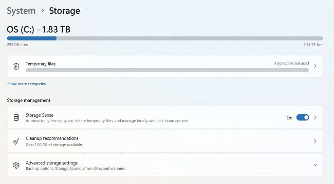 To ensure your PC is keeping your system as clean as possible, you can turn on the Storage Sense function. This will delete temporar y files and cache, which automatically frees up space. Head into your OS settings, then Storage, and then toggle the Storage Sense switch. For additional settings, click on Storage Sense to open up all the options for scheduling, your recycling bin, and the downloads folder.