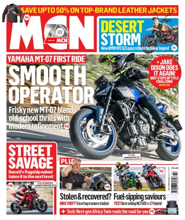 Dive into the latest edition of MCN, where we tackle bike theft with a trio of top trackers put to the test! Discover the high-tech Africa Twin that reads the road for you, and pay tribute to Dakar legends with the new BMW R12 G/S. Plus, thrill-seekers will love our first ride on the revamped Yamaha MT-07 and Ducati’s fierce Streetfighter V4 S. Don’t miss Jake Dixon's rise in Moto2—get all the insights, reviews, and news in one pulse-pounding issue.