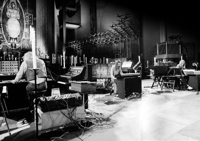 Holy communion: Tangerine Dream (from left) Edgar Froese, Christopher Franke and Peter Baumann performing at Coventry Cathedral, Warwickshire, October 4, 1975.
