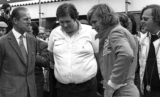Prince Philip mixes with the bad boys of F1 at the 1975 British Grand Prix. From left: Lord Hesketh, James Hunt and Bubbles Horsley.
