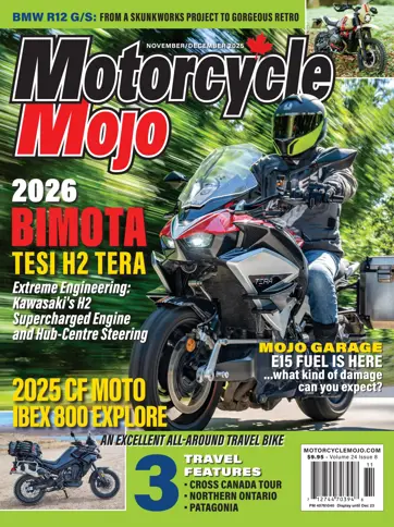 In this issue we bring you a test ride of the 2026 BMW R12 G/S, the company’s newest retro model; the 2026 Bimota Tesi H2 Tera, a bike with hub-centre steering and Kawasaki’s supercharged engine; and the very competent CFMOTO’s Ibex 800 Explore. Our travel features include a ride across Canada on an older budget motorcycle, a ride in Northern Ontario and braving the winds in Patagonia. Mojo Garage explains that E15 is here and the damage that will follow.
