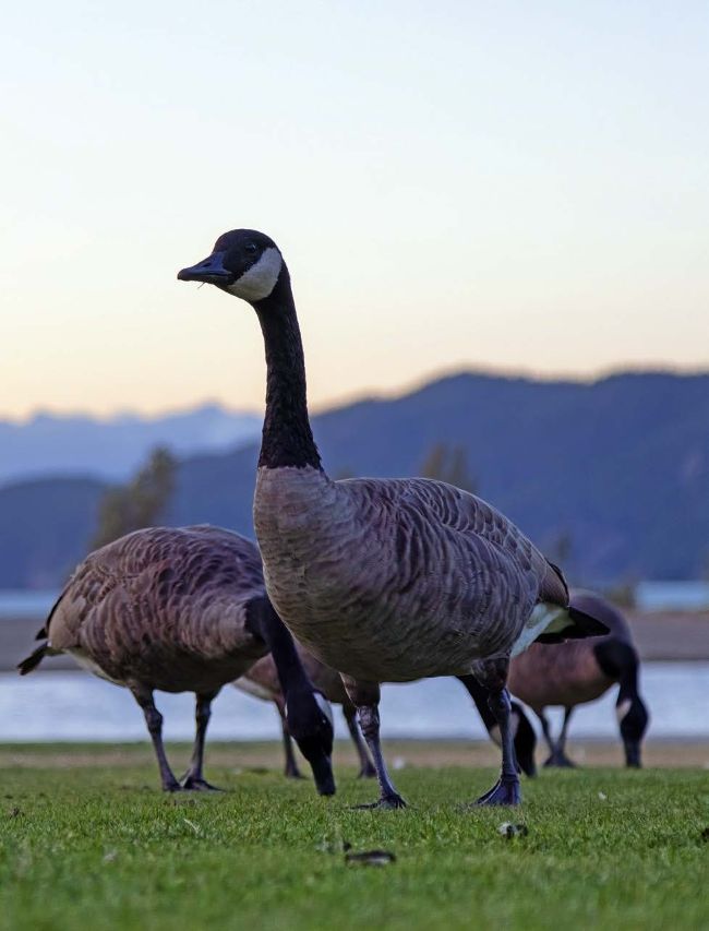 Clockwise from top left: The lakefront at Harrison Hot Springs; Canada geese beside the water; relaxing at Harrison Hot Springs; a Sasquatch statue in Harrison