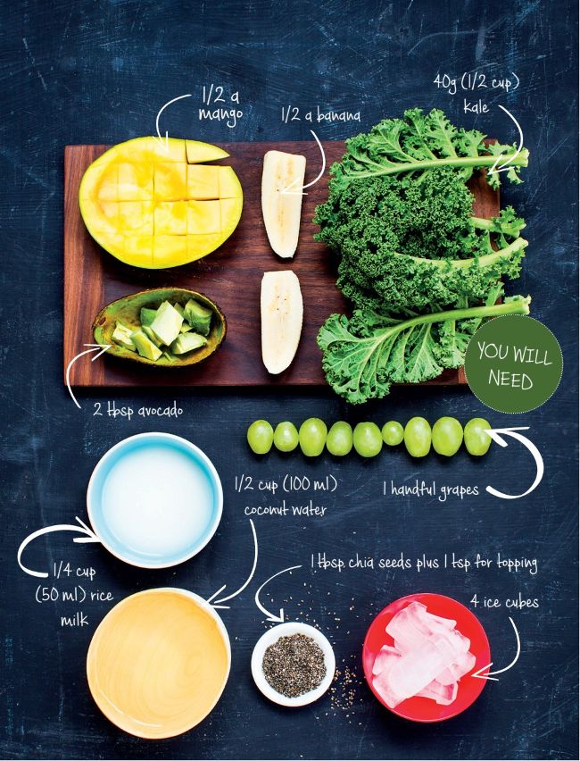 This exotic, green smoothie with mango, avocado, banana, and grapes awakens and revitalizes the body. The chia seeds make it a really powerful drink.