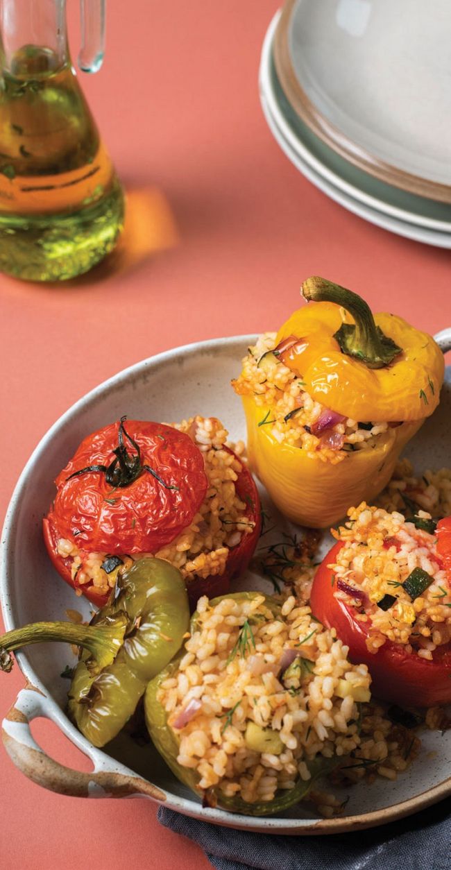 Juicy tomatoes and peppers stuffed with fragrant rice and fresh herbs make a perfect lunch, supper or part of a mezze table.