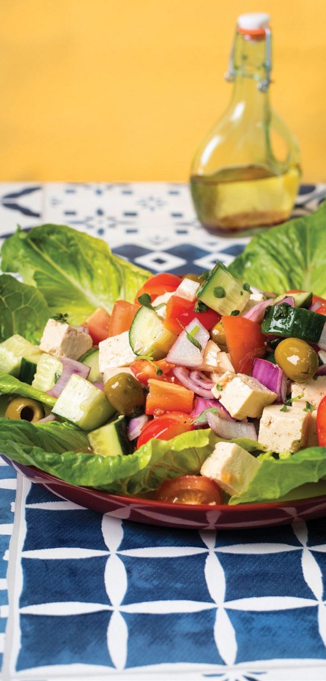 A delicious, chunky salad with a zingy dressing and topped with low fat, high protein tofu feta. Serve as part of a spread or as a meal on its own. It’s perfect for lunchboxes too!