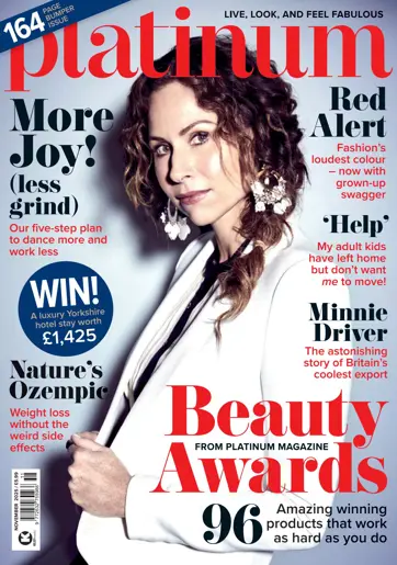 The November issue of Platinum stars Minnie Driver, actress, singer, warrior – we take a look at her enduring strength * It’s our Beauty Awards issue – the results are in! * Plus: Find more joy with our 5-step plan * Weight loss without the injections * Start your Pleasure Revolution! * Sentimental styling for your home * One-pot wonders for supper * Fashion, beauty, puzzles, travel and real-life stories * Plus, win a two-night break in Yorkshire worth £1,425!