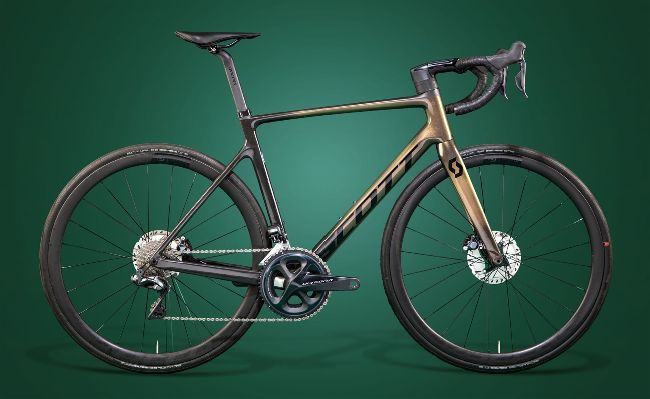 The new Addict from Scott is one of the best lightweight bikes that money can buy. As used by Team DSM on climbing days, the bike is more than just feather-light; it is incredibly stiff and aerodynamic, too. Scott say that it is the “first bike with completely integrated cable routing for both mechanical and electronic shifting without any compromise”. This is the model with an Ultegra Di2 groupset from Shimano, for perfect electronic shifting, and Capital 1.0 disc wheels from Syncros. The colour is Komodo Green, which will ensure that you stand out on the road.
