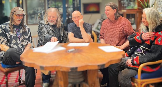 And who can begrudge him that? With Hawkwind’s previous two albums being recorded remotely via the less-than-exciting method of file sharing thanks to the global event that brought everything to a grinding halt – that’ll be 2020’s Carnivorous (released under the banner of Hawkwind Light Orchestra) and Somnia the following year – their latest and 35th studio album, The Future Never Waits, finds the band of Magnus Martin (guitars/vocals/ keys), drummer Richard Chadwick, bassist Doug MacKinnon and multiinstrumentalist Tim ‘Thighpaulsandra’ Lewis reunited to stand toe-to-toe in the creative environs of Dave Brock’s home studio on the grounds of his Devonshire farm.