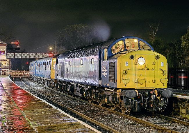 ‘WHISTLER’ TO THE RESCUE: The East Lancashire Railway’s DMU gala on November 18/19 included some loco-hauled drags using Type 2 No. 25279 and, as pictured here, Type 4 No. 40012 Aureol. The loco is seen on the evening of the first day at Ramsbottom waiting to haul Class 104 Nos. M50517+M50455 south towards Bury. The rain-soaked platforms only add to the atmosphere.