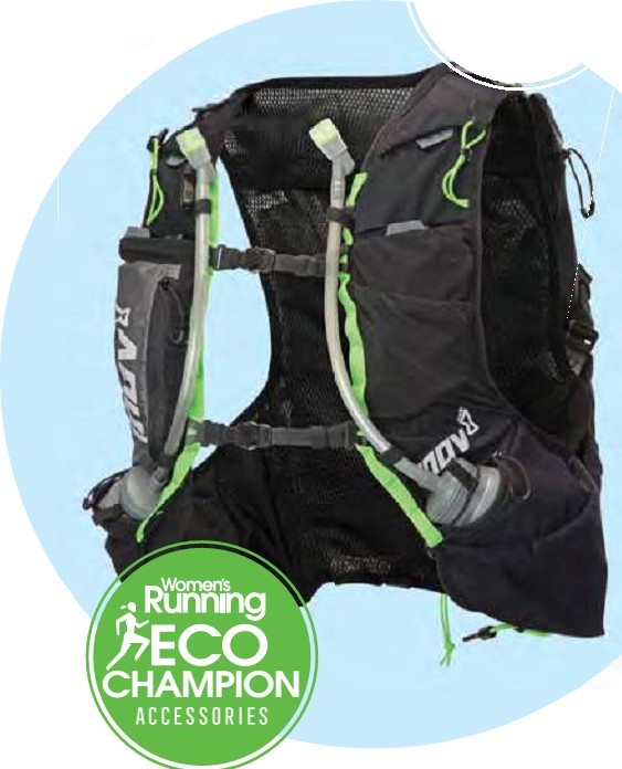 inov-8’s Race Ultra Pro 2in1 Vest is an ultrarunner’s dream. Everything you need is in the pack, from a removable 10L pocket to two soft flasks and one speedcupfi to ensure you are self-sufficient in cupless races, which raises the bar in terms of green creds. The fl asks can be worn higher or lower, with or without straws. Adjust the vest to fi t and you won’t need to worry about bounce or chafing, as the mesh inner fabric is very soft against your skin, even across the shoulders. Remove the pocket to get a pared down vest for shorter races; add it to be able to store extra kit and supplies for longer runs and more. There are multiple easy access stash pockets, it fi ts a 2-litre bladder and can carry your poles horizontally or vertically, too. For storage everything is covered, as well as comfort, and with two packs in one you’re sorted for any adventure all year round. This is a true investment: its versatility and durability make it a standout piece, one that should last a lifetime.