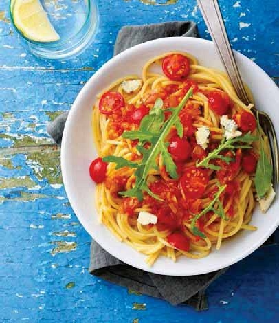 2 While the pasta is cooking, heat the oil in a large frying pan and then add the tomatoes. Allow them to cook for a couple of minutes until they start to blister, and then shake the pan, and let them cook for another minute or two, until soft, and then turn off the heat.