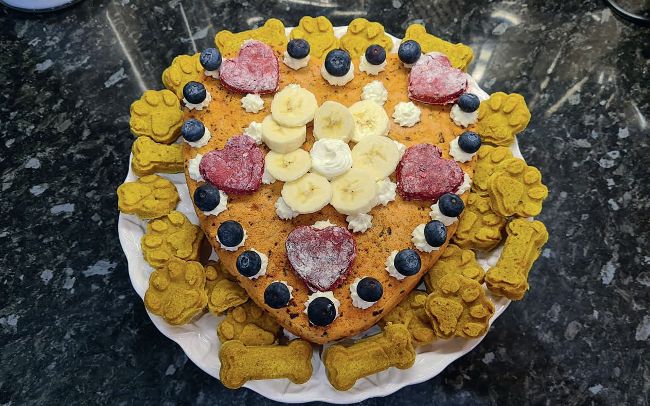 The Innocent Hound cake, decorated with banana, blueberries and cream cheese, Vet Chef Venison and Beetroot Love Hearts, and surrounded by the Sniffe & Likkit bite-sized cakes.