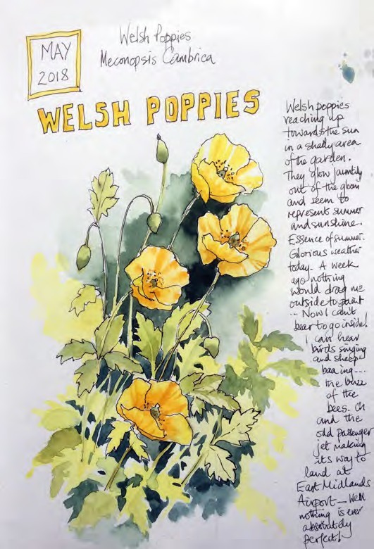 , pen and wash, A4. Here I started with an ink drawing of the poppies, added watercolour washes then fitted the writing around the illustration. It is fun to play with positioning the text and I often add more writing to the page as the design develops.