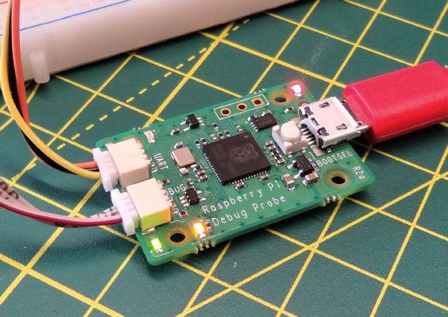 T he latest RP2040 device from Raspberry Pi isn’t a Pico, rather it is something we can use to debug a Pico. The Raspberry Pi Debug Probe is an RP2040-powered board designed for use with debugging tools. With it, we can interactively step through and identify issues with code running on a Pico (or other compatible device). The probe is used to observe data from a running program and provides a bridge between the Serial Wire Debug (SWD) port of the Pico, the three unsoldered pins opposite the Micro USB port and USB on your machine. Using the standardised CMSIS-DAP protocol, the Debug Probe can be used with debug software applications such as OpenOCD.