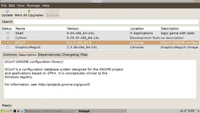 Gslapt is a GUI front end to the Absolute Linux package system. It’s a shame that it’s, confusingly, launched via the Software Updating entry on the menu system.