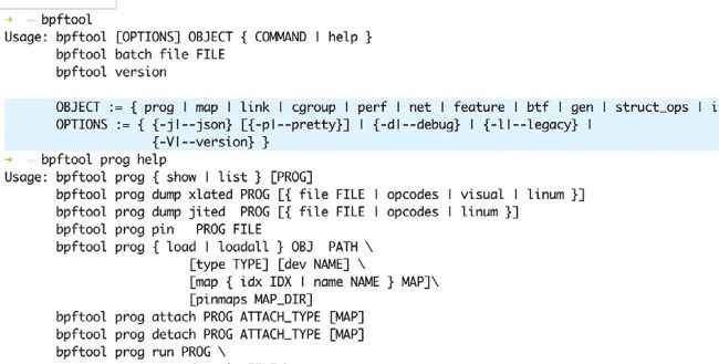 Two of the help screens generated by bpftool, enabling you to discover active eBPF sessions on a Linux machine and display the BPF code.