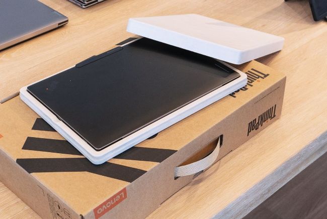 Left: ThinkPad packaging will be 100% plastic-free by the end of 2023.