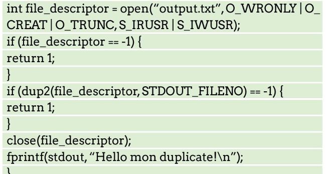 We close the original file descriptor to release the allocated system resources since we don’t need them any more; the file descriptor duplication ensures what goes to the standard output is also delivered to the file output.txt. Finally, the program prints the message Hello mon duplicate!\n using fprintf(), and since the standard output has been redirected, the message is saved in the output.txt file rather than being displayed on the terminal.