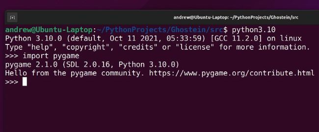 Here you can see the successful installation of Python 3.10 and PyGame after going into the Python interpreter.