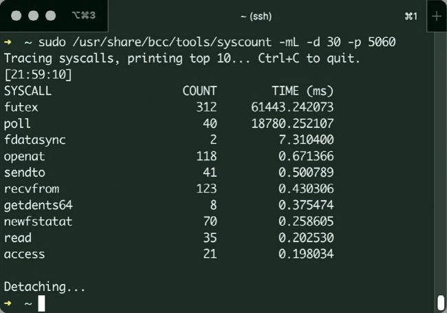 Figure 2: The output of syscount when used for tracing the operation of a MariaDB server for a period of 30 seconds.
