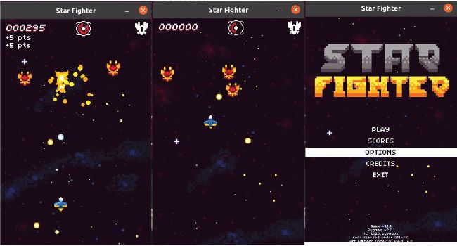 To install Python, open a terminal window (Ctr+Alt+T) and type sudo apt-get python3 followed by sudo aptget install pip3 . Then install the PyGame module by typing pip3 install pygame . To make sure that you’re using PyGame version 2.0 (because Star Fighter does use a fairly recent version of PyGame), type python3 -m pip install pygame==2.0.0 . You should now have version 2.0 of PyGame installed.