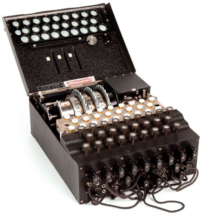 And so we come to the Enigma machine, the electromechanical contrivance used for encrypting and decrypting German military communications during WW2. We’ll look at how the number was derived later, but for now let’s say that the key length was around 77 bits. Admittedly, that gives 2,251,799,813,685,248 (around 2.25e+15) times fewer keys than today’s 128-bit ciphers, but we mustn’t forget that computing equipment was almost non-existent in the 1940s. And to illustrate how keys substantially shorter than today’s norm were previously adequate, a 56-bit key length was considered secure throughout the ’70s. We might be tempted to assume, therefore, that Enigma would have been uncrackable in its heyday.