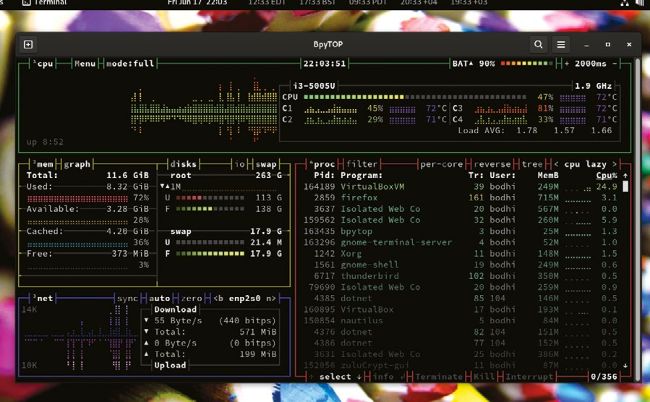 Think of bpytop as a super-charged version of the top utility for monitoring the resources on your computer. The CLI utility helps gauge and identify processes that are hogging the resources on your computer.