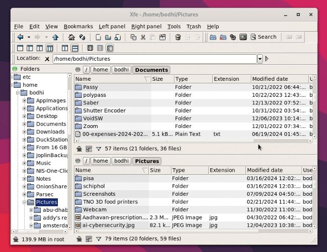 Beneath these, XFE has a location bar and a multipanel interface. On the left you get a directory tree, while on the right is the more familiar directory listing. Just like the toolbars, you can hide several other components in the file manager, such as the side panel.
