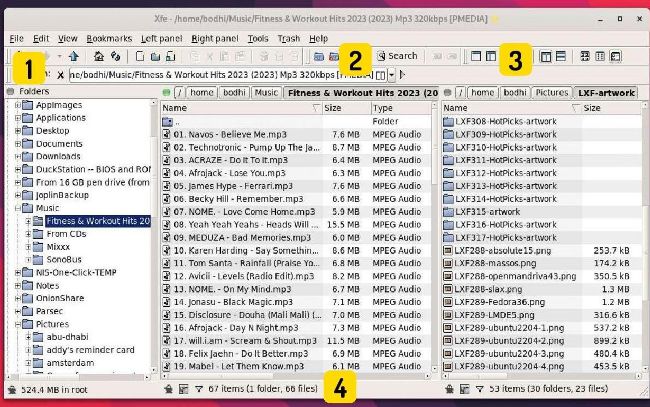 Here you’ll find buttons to change the appearance of the file manager. You can split the XFE window into two panes, two panes with tree view, one pane with tree view, or a single pane.