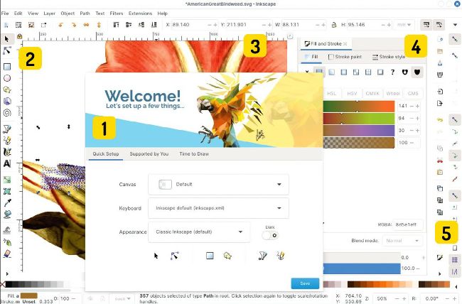 Now we have a fresh version that’s packed with new features. The appearance of Inkscape 1.1 back in May may have seemed like a minor dot release, but it’s actually a major milestone version. What you’ll quickly notice at the first launch of Inkscape 1.1 is the brand new welcome screen that enables you to perform some quick setup actions. There are five empty canvas presets available, with different colour schemes and transparency representations, lots of keyboard shortcuts presets, and also several icon themes for Inkscape’s tool bars. The welcome dialog has also a separate tab for New Document presets, which we think will come in handy for new Inkscape users.