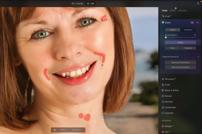 To create even smoother skin and turn back time, toggle open the Erase panel. Choose a small Brush Radius such as 10. Spray over any ‘crow’s feet’ around the eyes and any remaining spots and blemishes. Click Erase.
