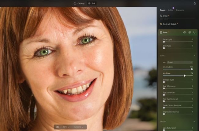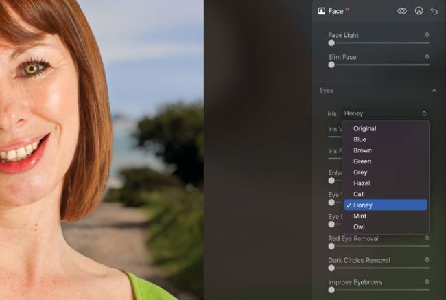 Any changes that you’ve made to the portrait are non-destructive. You can fine-tune or remove adjustments by clicking on the Edits panel. Here we’ve toggled open the Face section and changed the eye colour to Honey.
