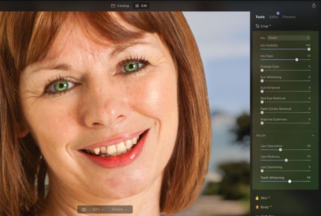 Scroll down to the Mouth section. Here you can drag sliders to give the lips more impact by increasing the value of the Lips Saturation and Lips Redness. Set Teeth Whitening to 60 for a winning, brighter smile.