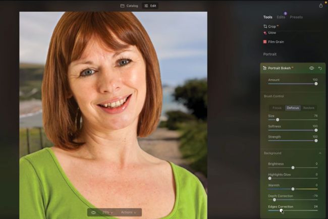 In the Catalog panel, click the Add Photos button. Browse to select a portrait. Click the Edit icon. In the Tools panel scroll down and click on Portrait Bokeh AI. Drag the Amount slider to 100 to blur the background.