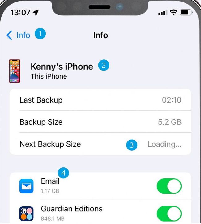 This screen also tells you the next backup size, so you can switch off some items or buy more storage. 4