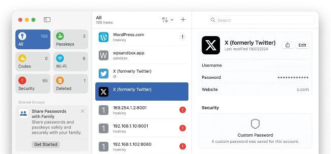 The app automatically accesses passwords and passkeys stored in the keychain you can share in iCloud, sparing most of us from having to import or add anything to get started, and syncing across devices when enabled in iCloud. Menu commands can import from other password managers using CSV files that won’t overwrite existing entries, and export in the same format. By default, Passwords suggests strong passwords in Safari, and automatically creates passkeys where supported. Codes for two-factor authentication (2FA) are generated for sites that support them within Safari like passkeys, as listed separately.