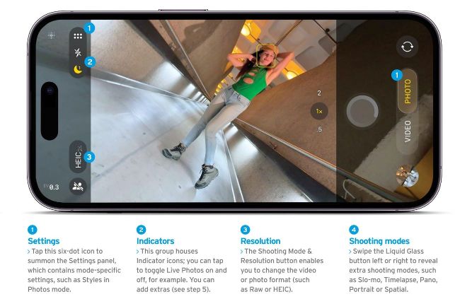 In previous versions of the Camera app, you could simultaneously see a wider spread of mode labels (such as Video, Portrait, Spatial, and Pano) spreading out below the Shutter button. iOS 26 streamlines the Camera interface by only displaying the two most useful modes –Photo and Video – by default. To access more hidden shooting modes, such as Spatial or Pano, simply swipe left to reveal them on the lozenge-shaped Liquid Glass button. Swipe right to access the Cinematic, Timelapse, and Slo-Mo shooting modes. By tapping on a mode’s button (or swiping up), you can summon a collection of large icons to adjust various properties specific to that mode, such as Aperture or Exposure.