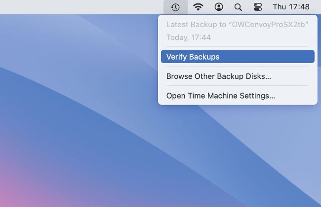 The Verify Backups command shown in Time Machine’s menu with the Option key only appears to work with backups on network storage.